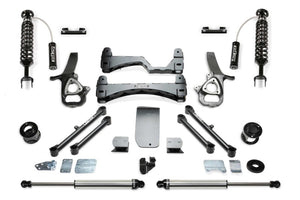 This system is a great choice for Ram 1500 owners looking to keep that stock ride yet want big tires and wheels. The factory suspension is relocated with heavy duty bolt on bracketry that will provide years of trouble free service. The system features Fabtech?s proven IFS technology with extended length ductile iron steering knuckles for proper factory electronic stability control functionality. Heavy duty 1/4" thick steel lower control arm crossmembers provide superior ground clearance while the integrated front differential skid plate adds protection to the drivetrain. Rear lift is accomplished with steel coil spring spacers that utilize the factory coil springs for stock load carrying capacity with a great highway ride. The Performance system includes Fabtech?s legendary stainless steel Dirt Logic 2.5 Coilover shocks for outstanding damping capacity with a superior highway ride. Rear shocks include the Dirt Logic 2.25. FEATURES: 1/4" thick steel lower control arm crossmembers are arched for maximum ground clearance. Four adjustable alignment cams provide a wide range of adjustment. The fully welded box design of these crossmembers provides additional strength to the front suspension. Extended length ductile iron steering knuckles retain near stock track width keeping the tires under the fenders. These steering knuckles are designed to work in conjunction with the factory ESC for proper functionality at all speeds. Constructed of a stainless steel body and NitroSteel? piston rod these 6" lift Coilovers are the finest quality on the market. They feature aluminum remote reservoirs to help dissipate heat and reduce shock fade. Extensive ride work was performed to ensure a superior ride on and offroad. Outstanding damping for offroad. A heavy duty front differential skid plate is constructed of 1/4" thick steel to protect the diff from offroad obstacles. Integrated differential mounts on the crossmembers properly reposition the front diff for the precise CV an