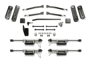 This Trail Lift Kit provides enhanced suspension performance to address all variants of off highway travel use including rock crawling, aggressive trail use and overland expeditions. This Gladiator lift kit has been tuned with proper dual rate coil springs and shock valving to provide a very compliant ride that you will appreciate. The system is a complete short arm suspension that utilizes the factory lower control arm mounts for an easy installation. The Fabtech lower link arms are constructed of thick wall steel tubing that are guaranteed never to bend. They come with large polyurethane bushings on one end with internal threads on the other to accept the groundbreaking Fabtech 5 Ton Joint? for longevity and a quiet ride. Fabtech?s dual rate Gladiator coil springs are corner specific to the Jeep JT. This keeps the vehicle level side to side and allows for increased suspension travel. The first stage of the spring provides a soft ride with the ability to extend for additional travel. The second stage is designed to handle the payload of the vehicle and address large impact absorption at higher speeds. To address the steering geometry with the increased ride height, a Draglink Flip kit along with a heavy duty Track Bar bracket is included. This relocates the Gladiator steering geometry to the factory plane allowing for full articulation without binding the draglink ends in extreme conditions. The rear Gladiator suspension receives a heavy duty Track Bar bracket to center the axle under the vehicle with the new ride height and help retain the factory roll center of the vehicle. Front and rear bumps stop extensions protect the Jeep Gladiator suspension from over cycling. This popular Jeep Gladiator lift kit is a top choice for daily drivers that enjoy tackling tough trails and overlanding with the comfort that they have a high quality complete suspension under their Gladiator. Each Fabtech component has been designed with specific features and benefits that cre