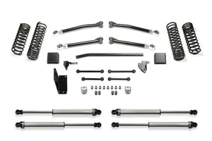 This Trail Lift Kit provides enhanced suspension performance to address all variants of off highway travel use including rock crawling, aggressive trail use and overland expeditions. This Gladiator lift kit has been tuned with proper dual rate coil springs and shock valving to provide a very compliant ride that you will appreciate. The system is a complete short arm suspension that utilizes the factory lower control arm mounts for an easy installation. The Fabtech lower link arms are constructed of thick wall steel tubing that are guaranteed never to bend. They come with large polyurethane bushings on one end with internal threads on the other to accept the groundbreaking Fabtech 5 Ton Joint? for longevity and a quiet ride. Fabtech?s dual rate Gladiator coil springs are corner specific to the Jeep JT. This keeps the vehicle level side to side and allows for increased suspension travel. The first stage of the spring provides a soft ride with the ability to extend for additional travel. The second stage is designed to handle the payload of the vehicle and address large impact absorption at higher speeds. To address the steering geometry with the increased ride height, a Draglink Flip kit along with a heavy duty Track Bar bracket is included. This relocates the Gladiator steering geometry to the factory plane allowing for full articulation without binding the draglink ends in extreme conditions. The rear Gladiator suspension receives a heavy duty Track Bar bracket to center the axle under the vehicle with the new ride height and help retain the factory roll center of the vehicle. Front and rear bumps stop extensions protect the Jeep Gladiator suspension from over cycling. This popular Jeep Gladiator lift kit is a top choice for daily drivers that enjoy tackling tough trails and overlanding with the comfort that they have a high quality complete suspension under their Gladiator. Each Fabtech component has been designed with specific features and benefits that cre
