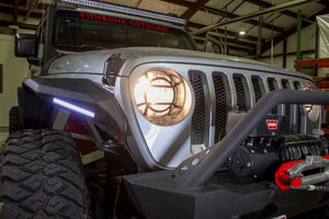 Fits 2018 to Current JL Wrangler, Rubicon and Unlimited, 2020 to Current JT Gladiator. Black powder coated Aluminum. Designed to mount over OEM headlights. Provides extra protection from off-road trees and brush.