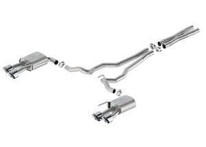 Upgrade the appearance and sound of your non-active dual tip exhaust Mustang with this full Cat-back exhaust package featuring quad 5" chrome plated stainless steel tips, Dark Horse quad tip valance and diffuser
