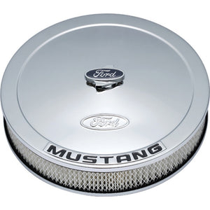 Add a Ford RACING, MUSTANG or COBRA Air Cleaner to your engine for that customized look. These 13" diameter air cleaners fit both 2 barrel and 4 barrel carburetors and include a high-performance filter element. Ford logo air cleaner center nut is also included.