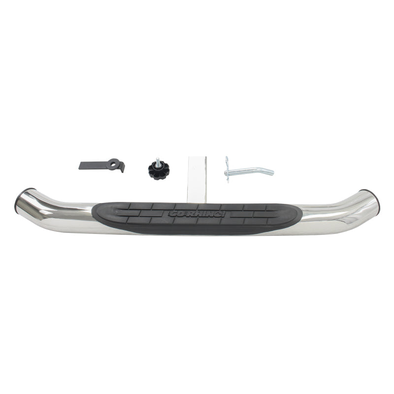 Provides easy rear step access to a truck bed, SUV and/or roof rack. Fits 2" receivers. Offers protection to vulnerable, molded bumpers in the event of a collision. Includes a convenient storage bag. Anti-rattle device included. Easily installed within minutes. Limited Lifetime warranty on materials, construction and Finish. Installation Instructions