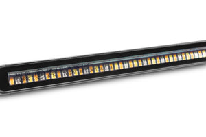 Multi-function, white, red and amber LED bar in an amazingly thin, less than 1” (0.9”) tall, housing. Red brake light, white running light, Amber running light with white flood light all in one unit! High pressure cast aluminum housing, all black patented optical luminous surface and no-hardware smooth glass-like polycarbonate lens. Available in 10”, 20” and 30” lengths with adjustable mounting brackets included.