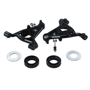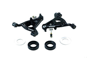 Install the Hotchkis Sport Suspension geometry corrected Tubular Lower A-Arms on your 70-81 Camaro or Firebird and gain vastly increased handling and control. These TIG-welded bolt-on have re positioned ball joints for increased caster and improved camber curve resulting in improved stability and traction. Adjustable shims offer ride height adjustment for ultimate performance and a great look regardless of engine and transmission combinations. Smooth operating Delrin bushings allow the arms to move through their travel easily. Finished in gloss black powder coat the arms are ready to install and are complete with ball joints bump stops ride height shims polyurethane coil spring locators and Delrin bushings. Exceptional handling performance when combined with the Hotchkis Sport suspension geometry corrected Tubular Upper A-Arms. New Lower Prices Features: Geometry corrected design. Built in - 0.6 deg of Camber 2 deg of Caster 100% TIG-welded 1.5 in. tubular steel construction. CNC machined inset spring cup. Precision aluminum ride height adjustment shims and polyurethane coil spring isolators. Easy to lubricate Delrin bushings. Lower ball joint installed. Laser cut Hotchkis logo Gloss black powder coat finish Made In USA Benefits: CAD designed and analyzed by FEA software for ultimate strength and efficiency. Increased structural rigidity due to CNC machined inset spring cup. Aluminum shims allow for .25 in. to .50 in. ride height adjustment. Additional shims available separately. Delrin bushings allow smooth operation with minimal deflection through travel range. Achievable specs when using 1106 upper control arm and 1108 lower control arm. MAX Caster with Uppers and Lowers = 9 deg MAX Camber with Uppers and Lowers = - 3.5 deg
