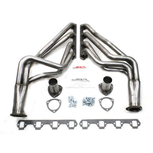 JBA long tube headers are the number one choice for maximum performance gains and high RPM efficiency. Available in 409 or 304 Series Stainless Steel. These long tube designs are dyno and race proven to deliver the greatest possible increase in horsepower and torque throughout the RPM range. All JBA long tube headers feature large mandrel-bent stainless steel primary tubes, oversized exhaust ports, extra thick 3/8 one-piece flanges, and proprietary JBA Firecone® merged collectors for smooth flow. Each system is designed to give the maximum amount of ground clearance possible, so lowered cars do not drag the collectors.