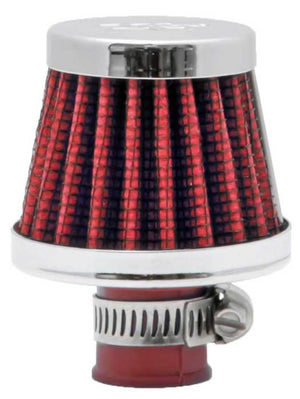 K&N crankcase vent filters are perfect for racing applications, vintage cars or individuals who want to add some aesthetics to their classic carbureted engine. The cone-shaped 62-1600RD crankcase vent filter has a K&N embossed chrome top and chrome base. The flange clamps directly onto a 3/8 to 1/2 inch metal or plastic tubing where venting is needed. Constructed with a red colored synthetic media it can be cleaned and reused repeatedly.