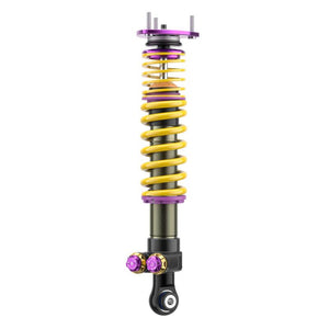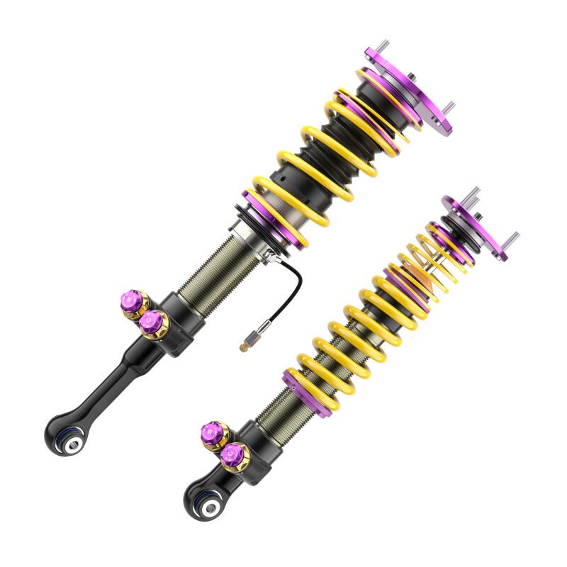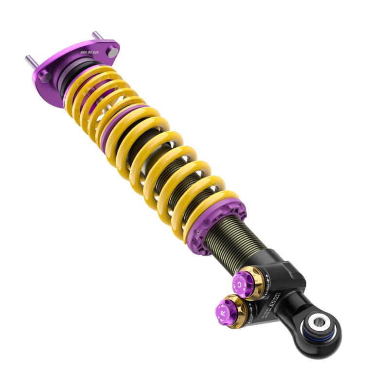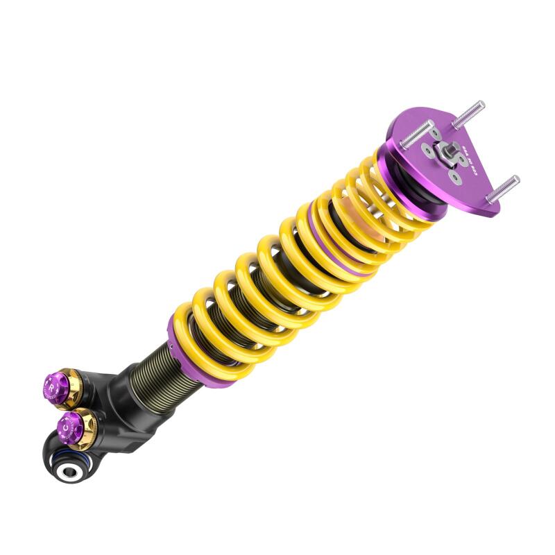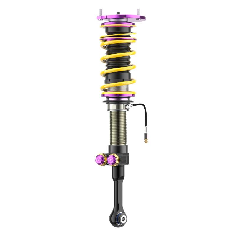 With the new KW V5 Clubsport coilover suspension, KW focuses on its successful motorsport suspension technology with KW Solid Piston Technology and modular design with damper valves connected in series. The KW V5 Clubsport assures precise and fast damping without delay. The shock absorbers and valves react directly, even with small spring travel, minimal steering movements, and minor road undulations. Every driving maneuver and input, such as those generated during braking, acceleration, steering, load changes, and undulations, are damped much more precisely. The KW Solid Piston dampers provide much more platform support to the chassis than conventional dampers and, depending on the vehicle allow for lower spring rates to be used. The KW V5 Clubsport with adjustable KW SPCLH-A (KW Solid Piston Compression Low- and Highspeed Adjustable) compression damping and KW SPRLH-A (KW Solid Piston Rebound Low- and Highspeed Adjustable) rebound damping offer significant added value: more sensitive damping, cavitation-free function, precise high-frequency damping, low-pressure gas range from 6 to 10 bar and low hysteresis. The valve units in the KW V5 Clubsport coilover suspension, which are built-in series with different valve spring types and main valves, offering the freedom to individually adjust the compression and rebound damping with 13 exact clicks (14 characteristic curves) each in the low- and high-speed range. The KW Solid Piston Technology can also be used to cover a large force range when designing the characteristic curves; all the more reason to enable a completely new type of harmonious damping. The KW V5 Clubsport coilovers feature our signature purple anodized KW Clubsport aluminum uniball solid top mounts for increased steering precision. Dial in a maximum or individual lowering within the tested adjustment range. Due to the dirt-resistant trapezoidal thread and the polyamide threaded ring, the continuous lowering can be adjusted quickly and easily.