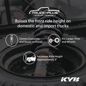 The KYB Truck-Plus Leveling Assembly is the best replacement strut assembly solution to raise the front of your truck. KYB does not cut corners or take a one-size?fits-all approach when designing and manufacturing the Truck-Plus. Unlike competitors, KYB manufactures corner-specific part numbers to help restore designed performance on your vehicle. Consider this, a strut assembly handles vehicle weight, determines ride height, acts as the steering pivot, controls vehicle stability and can affect a vehicles electronic crash avoidance systems. Don?t trust a part designed to fit multiple vehicles and don?t trust anything less than KYB.