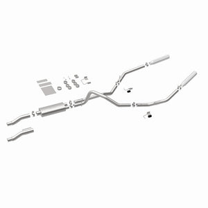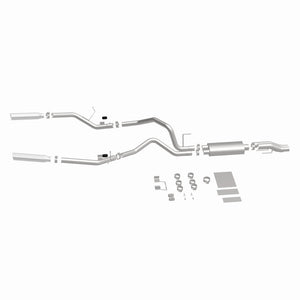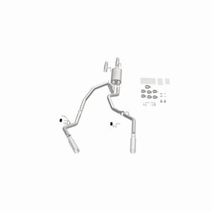 The MagnaFlow 2011-2014 Ford F-150 Street Series Cat-Back Performance Exhaust System 15460 brings out the personality of your 3.7L, 5.0L, 6.2L 2011-2014 Ford F-150 with our signature resonant, powerful engine tone and dyno-proven performance. Thanks to its fast-flowing, mandrel bent 3in. main piping and 1 Straight-Through mufflers ending in a Dual Split Rear exit with 3.5in. Polished Clamp-On Single Wall Angle Cut Rolled Edge tips, this Ford F-150 exhaust kit has the performance chops to match its sporty sound and appearance. Upgrade your ride to the next level with an exhaust that has the pipes to put other Ford F-150's to shame. With this system your vehicle will be producing Aggressive exterior and Moderate interior sound levels while leaving other cars and trucks feeling envious at every stoplight. Exhaust kit 15460 features a cat-back layout that replaces your ride's stock exhaust components from near the catalytic converter on back. Extensive 3D scanning during development has resulted in a direct-fit design that you can easily install yourself. 15460 is produced using CNC precision robotic manufacturing techniques and is backed by MagnaFlow's 1-year limited finish warranty and limited lifetime construction warranty.