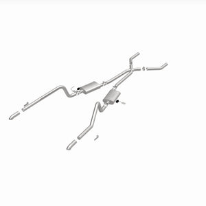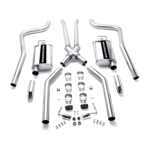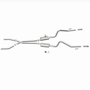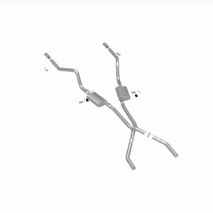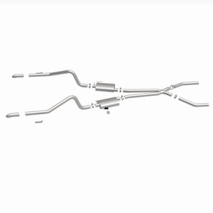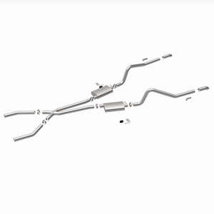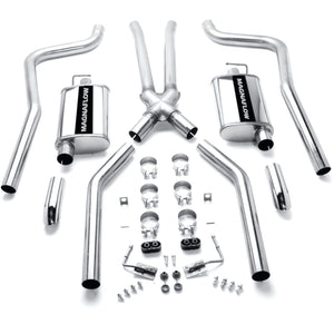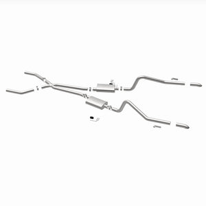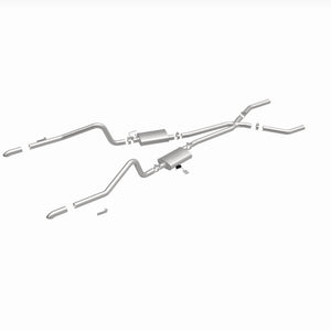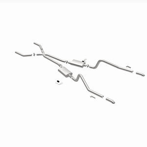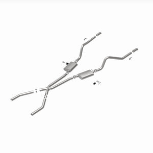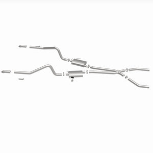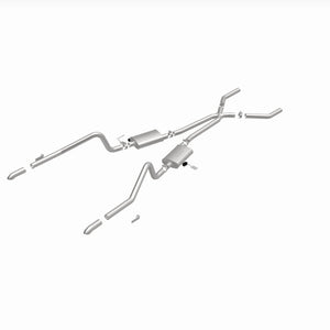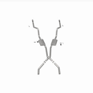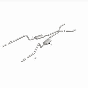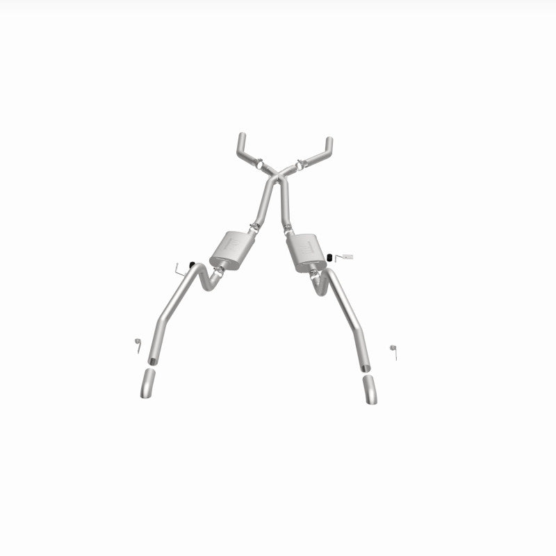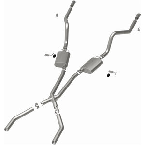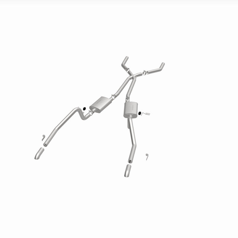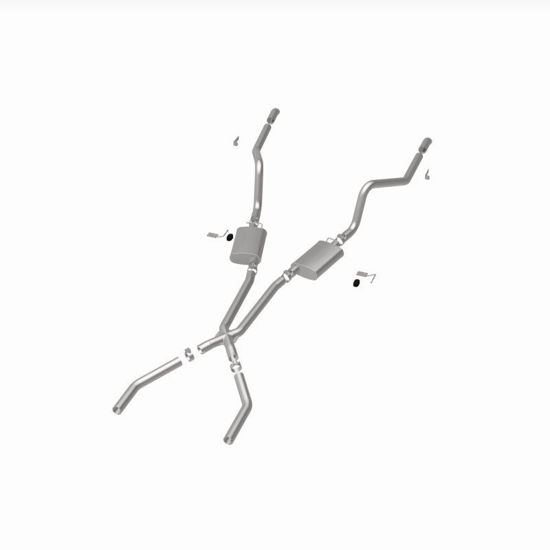 The MagnaFlow Street Series Crossmember-Back Performance Exhaust System 15851 brings enhanced engine sound and dyno-proven performance to your muscle car with a healthy helping of our deep, resonant signature exhaust note at Moderate exterior and Mild interior sound levels. Thanks to its durable, corrosion resistant stainless steel design, this exhaust system will handle whatever tarmac you decide to leave your mark on. This performance exhaust kit features a crossmember-back layout designed to replace your exhaust system from the crossmember on back. With its fast-flowing, mandrel bent 2.5in. main piping and 2 Straight-Through mufflers ending in a Dual Split Rear exit with 2.75in. Polished Welded-On Single Wall Turndown Cut Edge tips, your muscle car will be sounding as awesome as it looks. Extensive 3D scanning during development has resulted in a direct-fit design that you can easily install yourself. 15851 is produced using CNC precision robotic manufacturing techniques and is backed by MagnaFlow's limited lifetime construction warranty.