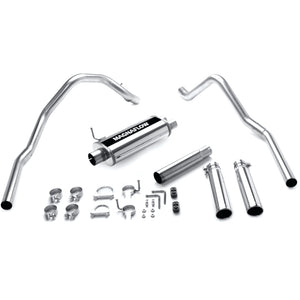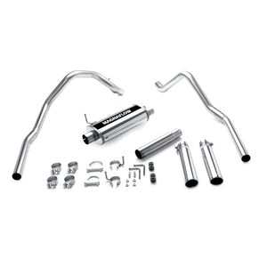 The MagnaFlow 1997-1999 Dodge Dakota Street Series Cat-Back Performance Exhaust System 15735 brings out the personality of your 3.9L, 5.2L, 5.9L 1997-1999 Dodge Dakota with our signature resonant, powerful engine tone and dyno-proven performance. Thanks to its fast-flowing, mandrel bent 3in. main piping and 1 Straight-Through mufflers ending in a Dual Split Rear exit with 3.5in. Polished Clamp-On Single Wall Angle Cut Rolled Edge tips, this Dodge Dakota exhaust kit has the performance chops to match its sporty sound and appearance. Upgrade your ride to the next level with an exhaust that has the pipes to put other Dodge Dakota's to shame. With this system your vehicle will be producing Aggressive exterior and Moderate interior sound levels while leaving other cars and trucks feeling envious at every stoplight. Exhaust kit 15735 features a cat-back layout that replaces your ride's stock exhaust components from near the catalytic converter on back. Extensive 3D scanning during development has resulted in a direct-fit design that you can easily install yourself. 15735 is produced using CNC precision robotic manufacturing techniques and is backed by MagnaFlow's 1-year limited finish warranty and limited lifetime construction warranty.