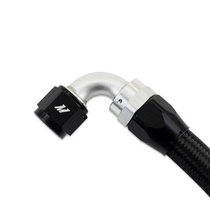 Extremely durable and flexible, this Mishimoto Braided Hose is an ideal addition to your vehicle. Whether you’re installing a turbocharger oil drain hose or adding an oil cooling system, these nylon-wrapped stainless-steel braided fluid hoses are available in multiple lengths to suit any application. In addition, each line includes pre-installed B-nut style 90-degree and straight -10AN fittings for leak-free operation. These Mishimoto -10AN lines feature a CPE rubber inner layer which provides a durable passageway for most fuels, oils, and engine coolants, while a woven stainless-steel inner jacket increases the pressure tolerance and durability. The nylon outer braid will not abrade soft materials such as plastic or aluminum in confined spaces. In addition, the black outer braid provides a very subtle, factory-like appearance. Our braided -10AN lines feature an operating temperature range from -10 degrees to 302 degrees and pressure rating of up to 1,000 PSI, making them applicable for most fluids or air passage systems on your vehicle. As with all our products, this Mishimoto Stainless-Steel Braided Line is covered by our Lifetime Warranty.