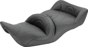 The 18" wide driver seat is 1" lower than stock, sits the driver back 1" and also accepts a fully adjustable and easily removable driver backrest (79904, sold separately). The nose of the seat is narrower than stock so the driver can easily plant his or her feet on the ground. The passenger seat is a full 18.5" wide with a bucketed shape to eliminate sliding forward. The Passenger Backrest features Mustang's unique "comfort wedge" that angles the passenger's upper back 2" more forward than stock for more vertical back support.