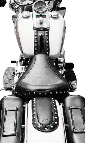 Mustang's Wide Touring offers similar positioning to stock but features a 14.5" wide driver area with deep bucket styling that keeps the rider from sliding back and provides excellent lower back support. Available with or without a fully adjustable and easily removable driver backrest. Pair the solo with the 10.5" wide matching passenger seat for comfortable 2-up riding. Recessed Passenger seats are designed for use with the built-in driver backrest.