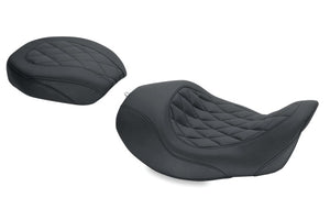 Take control of your ride! Mustang's Wide Tripper forward Solo moves the driver 1.5" forward to reduce the reach to the handlebars and foot controls. The 13" wide driver seat supports riders at the correct seating angle with extra width in the hip area for long-distance comfort. Available in black or distressed brown, in Original or Diamond Stitched styles, and with or without a built-in driver backrest that's fully adjustable and easily removable without tools.