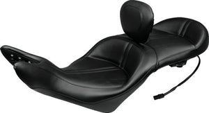 Mustang's one-piece touring seat features a wide bucket radius for both the front and rear seating areas, as well as a slightly lower seating position for both. Not only does Mustang's more comfortable design let the driver sit back into the 17.5" wide seat but the front nose area has been designed to eliminate that "crowded" feeling. The lower nose area also helps ensure that one's boots more securely reach the ground. The built-in driver backrest is fully adjustable, easily removable and offers more features than any other backrest on the market. The passenger is fully supported in a 15.5" wide bucket that is contoured for comfort.