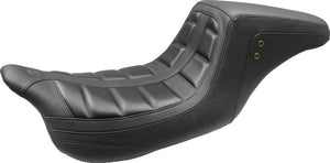 Mustang designers took one of the most popular seat platforms and gave it a completely new-and-improved look! The all-new Squareback for '08-up H-D Touring features a stylish split-panel tuck-&-roll design with contrasting smooth and perforated vinyl for a clean custom appearance. The recessed cross section helps alleviate tailbone pressure, while brass grommets add distinctive styling. Riders are seated in a 10.5" wide driver bucket in a position similar to stock, but benefit from significantly increased lower back support thanks to the high-rising wall. A squared-off 6.5" wide tail section provides a level foundation for passengers or luggage.