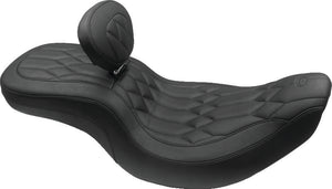 Driver backrest kits are designed for use with Mustang or stock one-piece touring seats only. Kit includes a frame-mounted receiver, plus fully adjustable backrest with forward/back and up/down adjustability, which also pivots to your ideal back angle. Backrest removes easily without tools and folds flat for storage. Popular Regal styling is tufted with hand-tied vinyl-covered buttons for a luxurious classic pillow-top look and unbeatable comfort.