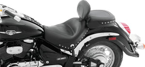 Mustang's popular touring seat features several design improvements over the stock seat. The deeply pocketed driver bucket sits you at the ideal cruising angle. The driver's back is well supported by the nose of the passenger seat that extends forward to create a full 6.5" high backrest, or via the optional built-in driver backrest. The entire width of the passenger seat is fully supported by Mustang's unique internal steel support wings for unbeatable comfort and support.