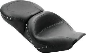 Mustang's one-piece ultra comfortable Standard Touring design provides the rider and passenger with the fullest, most comfortable seat possible. The seat nose is narrower than stock so that the rider can more easily plant feet on the ground. The 17" wide front bucket and the 14" wide rear seat are available plain or with black pearl-centered studs. The baseplate is open in the middle to accept a Mustang or H-D driver backrest kit.