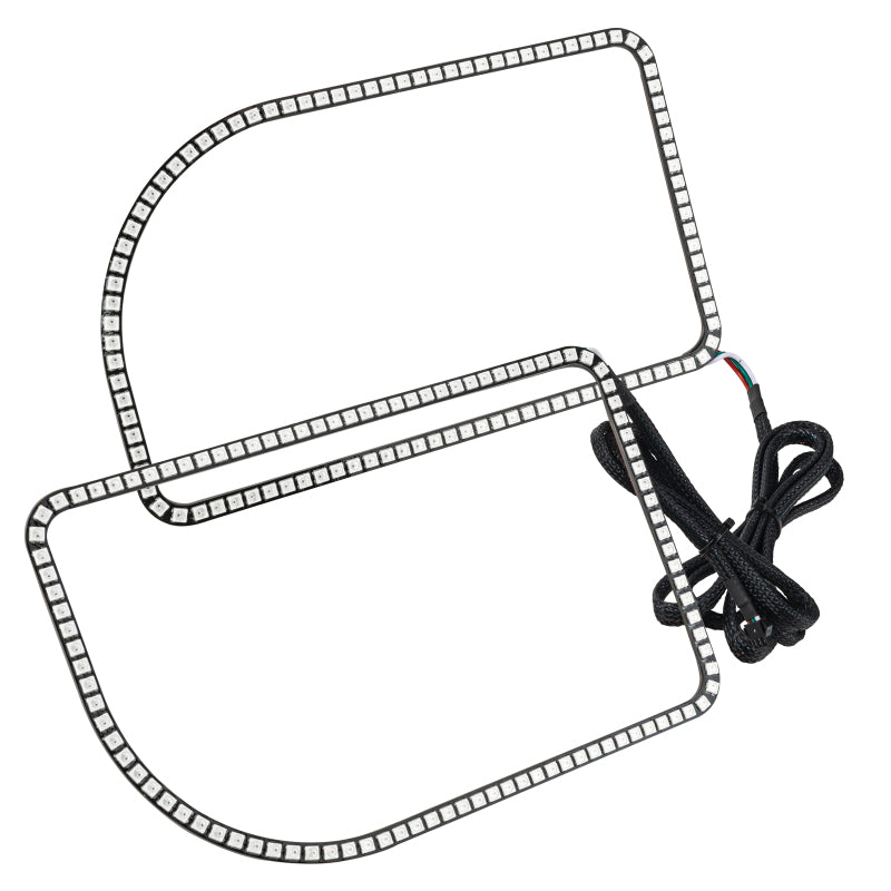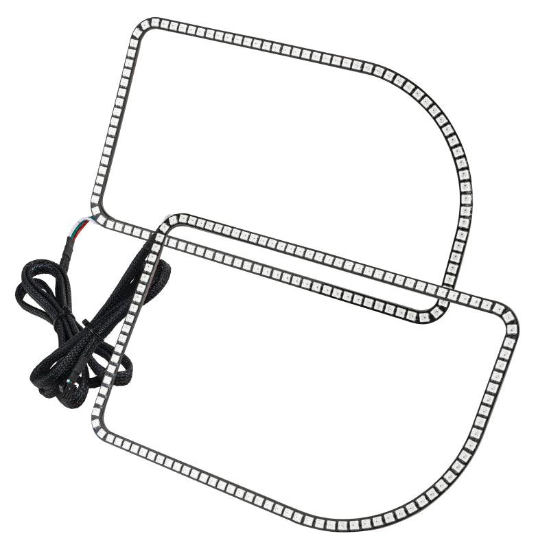 The new ORACLE Lighting Dynamic ColorSHIFT(tm) Halo Kit is the latest advancement in our expansive lighting modifications. The Dynamic features allow the user to run multiple moving color patterns through the Halo ring, creating a vivid eye-catching lighting effect. Conveniently controlled through a free smartphone App, the system features over 200 pre-programmed moving patterns as well as static color control and white mode for normal street driving. In addition to the pre-programmed features the user can also create custom designs through pixel editing in the app. Installation: New user-friendly design is a simple plug and play design making wiring easy for even a novice. Simply connect the ring terminals to the + and - battery terminals then control your lights from the smartphone app.