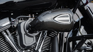 The C4 Series Air Cleaner sports a ground-breaking appearance with weight savings and performance gaines that embody the essence of racing and modern design. Featuring a beautifully sculpted ultra lightweight carbon fiber shell and forward-facing revers cone filter element. This air cleaner pushes the design envelope in the v-twin world to new horizons.