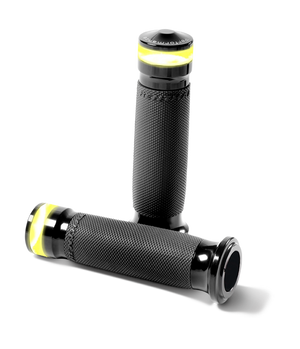Performance Machine grips are the perfect finishing touch to any handlebar set up. The billet aluminum Vision Series Contour grips feature end mounted indicators with extremely bright yellow LED turn signals built in for maximum visibility. Each grip comes with super comfortable Renthal rubber and boasts some impressive details right down to the PM logo on the tip of each grip. These grips are designed to mount to 1 in. bars for cable throttle and electronic throttle applications with standard CAN Bus wiring systems.