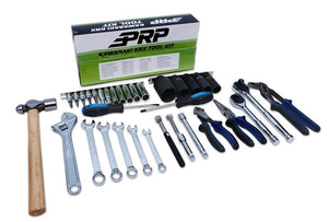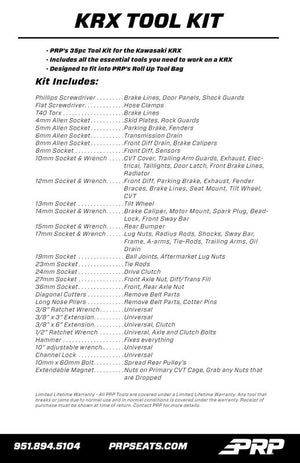 PRP's Kawasaki KRX Tool Kit provides everything you need to fix your Kawasaki Teryx KRX or KRX4 out on the trail. This 35 piece kit includes a selection of high-quality ratchets, sockets, wrenches, extension bars, pliers, and a ball peen hammer (for when things get really fun). We've hand picked the exact tools that are needed most when working on a KRX - So you have only the essentials that you really need, without adding the extra weight of an entire tool box. Below we have listed all the tools included, along with a handy guide to the most common uses for each tool. Each tool also includes a Limited Lifetime Warranty. This Kit includes Tools only. Designed to fit into PRP'S Roll Up Tool Bag. (Bag sold seperately or in our Combo Kit) Fitment: Kawasaki Teryx KRX & Kawasaki Teryx KRX4 KIT INCLUDES: ALLEN Sockets 4mmx3/8 - Skid plate, rock guards 5mmx3/8 - Parking brake, fenders 6mmx3/8 - Transmission drain 8mmx3/8 - Front diff drain, brake caliper TORX BITS- Sockets T40x3/8 - Brake lines SOCKETS/WRENCHES 8mmx3/8 - Front diff, sensors 10mmx3/8 - CVT cover, trailing-arm guards, exhaust, electrical grounds, taillights, door latch, front brake lines, radiator 10mm End Wrench 12mmx3/8 - Front diff, parking brake, exhaust, fender braces, brake lines, seat mount, tilt wheel, CVT 12mm End Wrench 13mmx3/8 - Tilt wheel 14mmx3/8 - Brake caliper, motor mount, spark plug, bead locks, front sway bar 14mm End Wrench 15mmx3/8 - Rear bumper 15mm End Wrench 17mmx3/8 - Deep Socket Lug nuts, radius rods, shocks, sway bar, frame, A-arms, tie-rods, trailing arms, oil drain 17mm End Wrench 19mmx1/2 - Deep socket Ball joints, aftermarket lug nuts 23mmx1/2 - Tie-rods 24mmx1/2 deep socket - drive clutch 27mmx1/2 - Front axle nut, diff/trans fill 36mmx1/2 - Front/Rear axle nut EXTRAS Phillips Screwdriver: Brake lines, door panels, shock guards, firewall Flat Screwdriver - Hose clamps Needle nose Pliers - Cotter pins, remove belt parts Channel Lock Diagonal cutter - Remove Belt Par