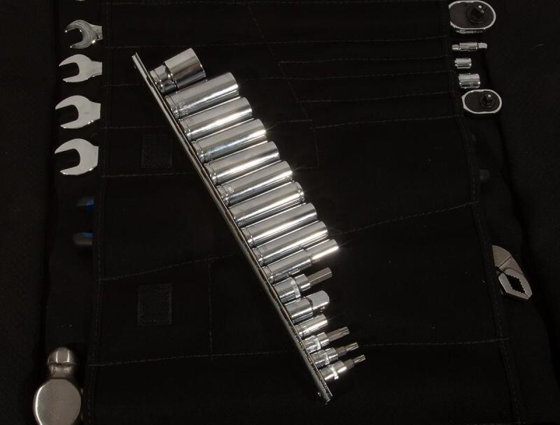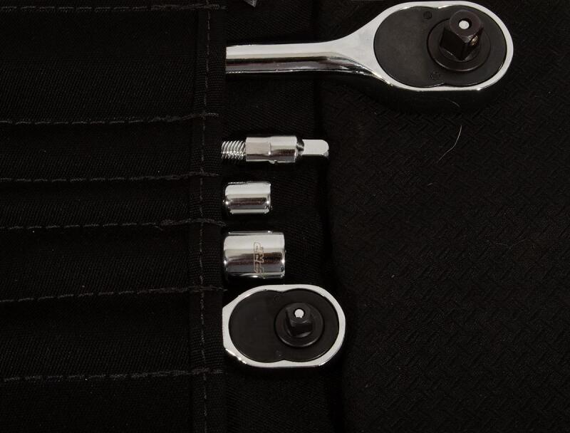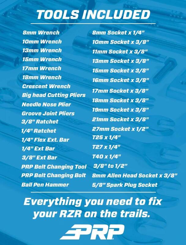 PRP's Polaris RZR Roll-Up Tool Kit provides everything you need to fix your RZR out on the trail. This 39-piece kit includes a selection of high-quality ratchets, sockets, wrenches, extension bars, pliers, and a ball peen hammer. We have hand-picked the tools most commonly needed when working on a Polaris RZR so you'll have the essentials that you need! Made from extremely durable twill material, the Polaris RZR Roll-Up Tool Kit makes it easy to keep everything neat and organized. The bag is made from extremely durable twill material, features heavy duty buckles, and has an easy to carry grab handle. A zippered pocket holds all the sockets you'll need and any other tools you want to bring with you. The tool bag can be mounted, or stored securely inside the vehicle. The roll-up style bag makes it quick and easy to grab out of the vehicle when you need it, and the tools inside don't make noise when bouncing around the trails.  This kit also comes with PRP's innovative RZR Belt Changing Tool. This tool makes it quick and easy to change the belt on your Polaris RZR 570, 800, XP 900 & XP 1000. Rather than use a wrench to hold open the secondary clutch, our simple tool ‘locks’ the clutch open. Simply insert the tool, tighten down the bolt, and leave it in place while you change the belt. Change a belt in seconds! For Turbo, Turbo S, RS1, and PRO XP, & PRO R's we've included a hardened 1/4" bolt in the RZR Roll-Up Tool Kit. Rather than using the L-shaped clutch wrench that's included in the stock Polaris tool kit you can simply insert this bolt, and use a ratchet (or impact) to tighten it down in seconds. The bolt holds the secondary clutch open, so you can quickly and easily change the belt. Don't get caught out on the trail unprepared. PRP's Roll-Up Tool Kit has everything you need to get your RZR going! Plus, each tool also includes a Limited Lifetime Warranty! Testimonial "This tool burrito is the product I end up using the most, and has pretty much everything y