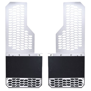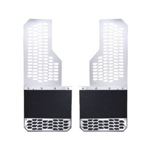 Protect your fenders from debris with our stainless steel Hex mud skins. These units are the perfect blend of style and protection for your truck from rocks, mud, snow, and anything the elements can throw at you and your ride. Choose from a front pair, rear pair, or a full set of mudflaps.These American-made mud flaps are constructed out of heavy-duty quarter-inch rubber that is held to your truck with 18 gauge stainless steel. We offer them in polished stainless steel or brushed stainless steel. These Hex mudguards are also great for any truck that has oversized tires because of their offset design. Installing our hex shield mud skins is easy with no drilling and all mounting hardware included. So if you are looking for a one-of-a-kind style but want extra protection from debris, our Stainless steel Hex Mud Skins are perfect for you. Get these limited lifetime warranty mud flaps ordered today!