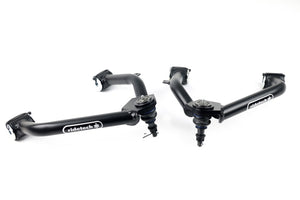 Front upper StrongArms for 2014-2018 Silverado / Sierra 1500 2WD/4WD with OE stamped steel or aluminum control arms (2019 Legacy & Limited). Includes a pair of tubular control arms with ball joints and delrin bushings. Powder coated black.