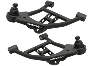 Front lower StrongArms for 1967-1969 GM F-Body. For use with Coil-Over/Shockwave. Includes a pair of tubular control arms with ball joints and delrin bushings. Powder coated satin black.