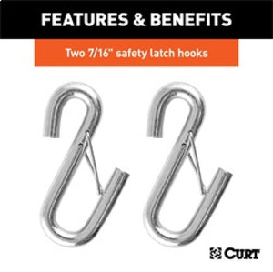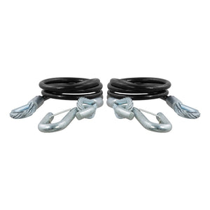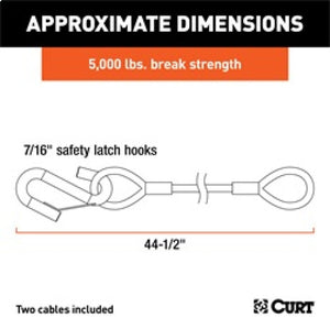 Curt's 44 1/2 in. Tow Bar Safety Cable Kit is the smart, safe and in most cases - required by law, way to tow. No matter how far you are planning to drive - down the street or across the state - without safety chains attached, there is a serious risk of danger if your trailer or towed vehicle becomes uncoupled from your trailer hitch. An alternative to traditional safety chains is Curt safety cables. Safety cables are a medium-duty safety option and are very effective for most standard trailers or towed vehicles. Curt safety cables are coiled so they do not drag on the ground, and they are fitted with safety latches, instead of S-hooks, to prevent them from becoming unhooked even over bumps and rough roads. One unique feature of Curt safety cables is their vinyl coating. Being coated in a vinyl skin keeps these cables well protected from rust, reduces the amount of noise they make and makes them easier to handle. These particular safety cables offer a minimum break force of 5,000 lbs. and measure a total length of 42 in..