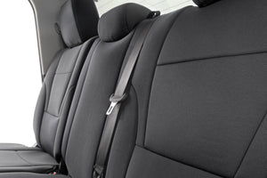 Want to protect your seats or are your seats showing signs of wear and tear from daily use? Say goodbye to unsightly stains and deterioration with Rough Country's Neoprene Seat Covers - the ultimate solution for preserving your vehicle's interior. Snug Fit for Optimal Protection: Our seat covers are tailored to fit your seats perfectly, providing a protective barrier against spills, scratches, and everyday wear and tear. Factory-Spec Construction: Engineered to meet factory specifications, our covers blend seamlessly with your vehicle's interior, giving it a fresh, new look without compromising on quality or style. Four-Layer Defense: With a four-layer construction featuring foam padding and a durable polyester shell, our seat covers offer unmatched protection and longevity, ensuring your seats stay looking new for years to come. Breathable and Water-Resistant: The neoprene layer not only provides breathability for added comfort but also boasts water-resistant properties, safeguarding your seats from spills and stains. Complete Coverage: Our covers come with full protection for your front seats, including headrest covers where applicable, as well as rear covers to shield your back seats from children and pet-related mishaps. Peace of Mind Warranty: Rest easy knowing your purchase is backed by our two-year warranty, giving you confidence in the durability and reliability of our product. Don't let worn-out seats diminish your driving experience. Upgrade to Neoprene Seat Covers today and enjoy a fresh, stylish interior that's protected against the rigors of daily life on the road.