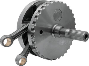 This 4-3/8" stroke 8-1/2" diameter flywheel assembly replaces the original flywheels 2007-'16 HD® big twin engines, when using stock pistons. Wrist pin end of connecting rods is tapered like stock rods. Sprocket shaft has the bearing race pressed on and is compatible with stock roller sprocket shaft bearing. Flywheel assembly is three piece design. Assembly is trued to less than .0005" runout on pinion and sprocket shaft bearing surfaces, making them capable of higher rpm and fully compatible with gear drive cams.