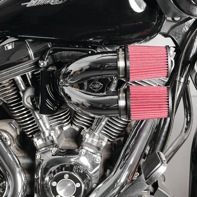 Air flow is everything in a performance engine and naturally it begins at the air filter. Factory units are downright boxy and can be very restricitve. The S&S Cycle Tuned Induction Air Cleaner utilizes two laser cut and highly engineered tubes merged into a single collecter and fed by a pair of high flow air flilters placed directly in the air flow. The end result is maximum performance for your engine and a stylish package.