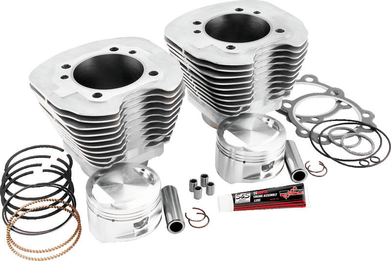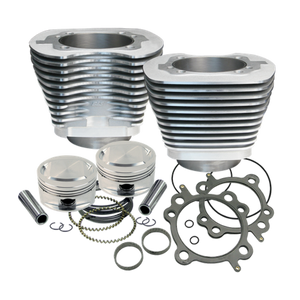 This cylinder and piston kit for S&S 95" big bore kits may be used to replace the stock cylinders, when building a 95" big bore engine. Also handy for repair of an existing 95" engine. Cylinders are finished with a durable silver powder coat that matches the stock engine finish. Kit includes S&S 3-7/8" bore cylinders and forged stroker pistons for stock 4" stroke flywheels, rings, wrist pins, and head and base gaskets. For best performance, appropriate camshafts, performance air cleaner, performance exhaust and fuel system tuning are required.