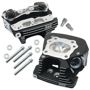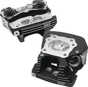 These S&S® Super Stock® high performance cylinder heads are designed for 1999-'05 engines with stock crankcase. They work well with engines of stock displacement, but are ideal for somewhat larger stroker or big bore engines up to 110". The 79cc combustion chamber provides a slightly higher than stock, which makes most performance cams work better. Machined for S&S® compression releases. The large 1.940" intake and 1.575" exhaust valves maintain port velecity for good low and midrange response, but supply enough air for stock and slightly larger engines to perform to their full potential. S&S® High performance valve springs allow the installation of camshafts with up to .650" lift. Compatible with stock rocker boxes, exhaust, and intake manifolds. Wrinkle black powder coat finish matches stock black engine components.