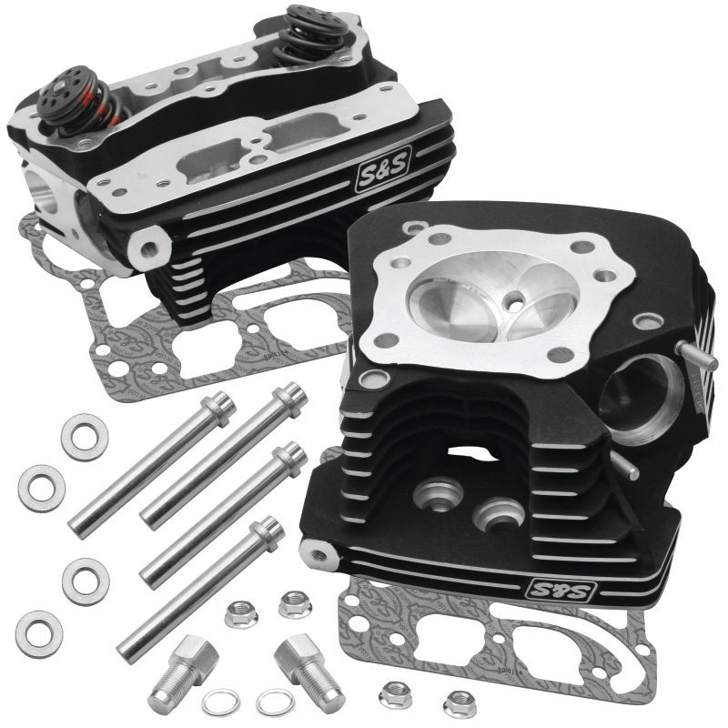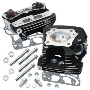 These S&S® Super Stock® high performance cylinder heads are designed for 1999-'05 engines with stock crankcase. They work well with engines of stock displacement , but are ideal for somewhat larger stroker or big bore engines up to 110". The 89cc combustion chamber provides a slightly higher than stock, but still manageable compression ratio in larger than stock engines. This makes them a good choice for touring bikes and other heavy vehicles. The large 2.000" intake and 1.605" exhaust valves maintain port velecity for good low and midrange response, but supply enough air for slightly larger engines to perform to their full potential. S&S® High performance valve springs allow the installation of camshafts with up to .650" lift. Intake ports flow 264 cfm compared to stock heads at 182cfm. S&S® High performance valve springs allow the installation of camshafts with up to .650" lift. Compatible with stock rocker boxes, exhaust, and intake manifolds. Black wrinkle powder coat finish matches stock black engine components.