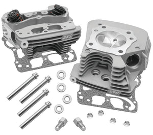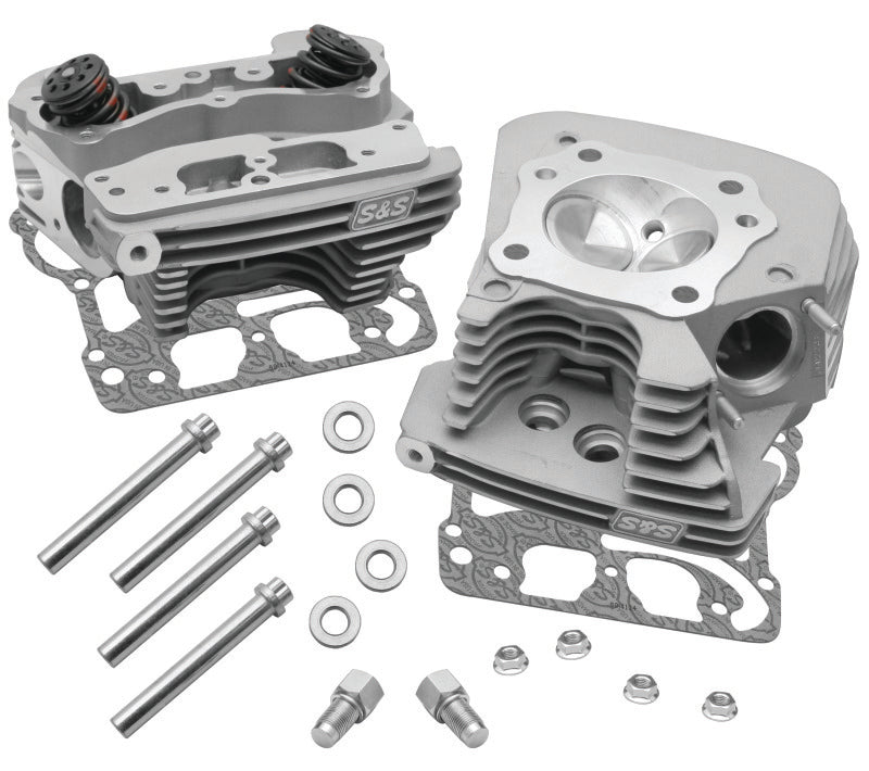 These S&S® Super Stock® high performance cylinder heads are designed for 1999-'05 engines with stock crankcase. They work well with engines of stock displacement, but are ideal for somewhat larger stroker or big bore engines up to 110". The 89cc combustion chamber provides a slightly higher than stock, but still manageable compression ratio in larger than stock engines. This makes them a good choice for touring bikes and other heavy vehicles. The large 2.000" intake and 1.605" exhaust valves maintain port velecity for good low and midrange response, but supply enough air for slightly larger engines to perform to their full potential. S&S® High performance valve springs allow the installation of camshafts with up to .650" lift. Intake ports flow 264 cfm compared to stock heads at 182cfm. S&S® High performance valve springs allow the installation of camshafts with up to .650" lift. Compatible with stock rocker boxes, exhaust, and intake manifolds. Silver powder coat finish matches stock silver engine components.