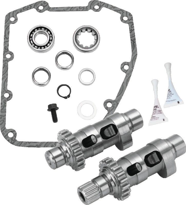 S&S HP103CE Easy Start chain drive camshaft kit for 1999-2006 HD Big Twins except 2006 HD Dyna are recommended for modifed engines with larger displacement and higher compression. More torque and horsepower than bolt in cams can deliver. Stock valve springs in 2005-2006 engines may be used with MR103 and HP103 cams. An S&S oil pump and cam support plate, along with a stock 2007 and later style hydraulic cam chain tensioner upgrade is highly recommended for chain drive cams.