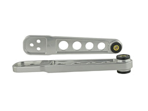 Skunk2’s Clear Anodized Rear Lower Control Arms for the ’01-’05 Civic are based off of the same technology the company’s been using on its own race cars for more than a decade and are a must-have for enthusiasts looking to fine-tune their suspension for maximum handling performance. Skunk2’s Rear Lower Control Arms are direct replacements, maintain OEM suspension geometry, and are ideal for street and race applications. Each arm is forged from aircraft-quality 2024 billet aluminum, precision CNC-machined, and is more than 25 percent lighter than the OEM arms. Skunk2 Rear Lower Control Arms also feature adjustable anti-sway bar mounting holes for advanced suspension tuning and optimum balance. The low-deflection, polyurethane bushings act as bearings for quicker response and a more positive feel. Skunk2 also eliminated tearing and un-seating problems typically associated with other fixed rubber bushings by allowing the arm to rotate freely about the bushings. Properly designed suspension components must be strong and functional first and aesthetically pleasing second. Skunk2’s Rear Lower Control Arms are both. Each arm’s I-beam shape and tapered design is a direct result of efforts to eliminate twisting, bending, and stress risers. Extensive FEA (finite element analysis) testing determined that conventional “straight and flat” designs are plagued by internal stress risers. A poorly designed arm will concentrate stress in particular zones, causing the arm to fracture and ultimately fail. For maximum suspension performance, Skunk2 Rear Lower Control Arms are best complemented with Skunk2 Rear Camber Kits, Lower Arm Bars, and Strut Tower Bars.