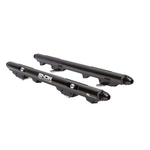 If you're looking for cheap fuel rails with crappy mounting brackets that allow fuel leaks, this product is not for you! If you're looking for the best fuel rails on the market, you have come to the right place. Snow Performance Fuel Rails are designed and built in the USA from the highest quality components available. Snow fuel rails are CNC machined for a perfect fit and are anodized in black for the ultimate in looks and corrosion resistance. These fuel rails are supplied with brackets to accommodate factory height injectors. Optional fuel rail brackets and/or injector spacers are available separately to adapt all of the popular LS length injectors to all of the popular LS and truck intake manifolds. Our fuel rail brackets are made from high-strength stainless steel to ensure the rails stay in place and do not leak in high-pressure conditions. Snow rails are ready to flow as much fuel as your engine needs, made for use with 8AN ORB fittings in the inlets/outlets of the rails there is no need to worry about fuel leaks or flow restrictions. These rails also incorporate two 1/8-NPT ports in each rail for gauges, sensors, or fuel fittings to feed your nitrous system with no additional fittings required. Kit includes: Two Billet Fuel Rails, Four 1/8-NPT Plugs, Four 8AN Inlet/Outlet Fittings, Stainless Steel Mounting Brackets for stock height injectors. Non-stock height injectors can be used in conjunction with Snow Performance adapter fuel rail brackets and/or injector spacers (available separately).