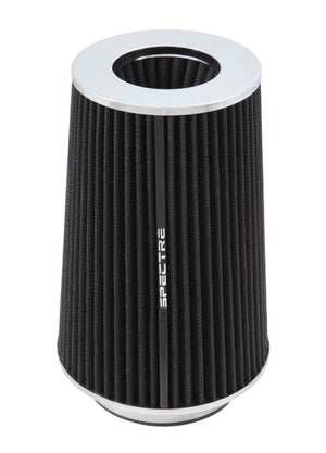This Spectre High Performance Racing (HPR) Air Filter is a black media clamp-on cone filter that can be used for a wide variety of applications. Using the included adapter rings, this filter can fit 3 inch, 3-1/2 inch, and 4 inch diameter tubes. Manufactured using high quality materials throughout, including oiled synthetic media, urethane, and steel mesh, this washable performance filter is precision engineered for low restriction and better performance. This filter's top houses an inverted cone filter for improved service life and enhanced flow potential. Designed with a triple chrome plated steel top and base, this 9-1/2 inch tall air filter is factory pre-oiled and ready to use.