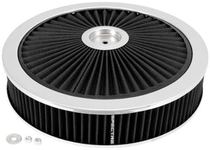 Spectre's 14 inch by 3 inch tall Extraflow air filter assembly is designed to fit throttle body injection assemblies and carburetors with a 5-1/8 inch neck flange. Featuring a zinc plated 1-1/4 inch drop base for increased hood clearance, this assembly requires 2.9 inches of clearance above the carb flange when installed. This assembly includes an ExtraFlow filter lid, which increases filter area and allows it to outperform standard closed lids. Available with black synthetic media, our Extraflow assemblies are designed to provide greater performance than ordinary paper filters by increasing air flow into the engine.