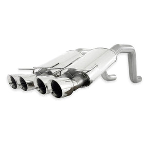 2006-13 C6ZO6 and ZR1 Corvette 3" axle back exhaust. Lightweight 18 gauge 304 SS with mirror polished chambered turbo style mufflers with Quad 4" slash cut conical double wall polished tips. More subtle musclecar tone that works great with headers and high flow cats.