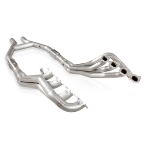 2011-14 Shelby GT500 1 7/8" headers and lead pipes. Tig welded 304 s/s headers with 3/8" thick flanges and smooth flow collectors. Oval exhaust ports that are an exact match to the factory cylinder head. 3" OD slip joint collectors with merge spikes. Includes 3" dia. lead pipes with high flow metal matrix catalytic converters and H-pipe. Fits factory connection point for use with factory or Stainless Works exhaust.