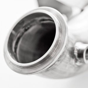 2013-18 Ford Focus ST 2.0L 3" catted downpipe. Includes hangers and flex joint. This 3" downpipe is fully 3" front to back with V-Band flange at the turbo and two bolt flange at the catback factory connection point. Works with OEM or Stainless Works catback (FC13CB-RT, FC13CB-WT)