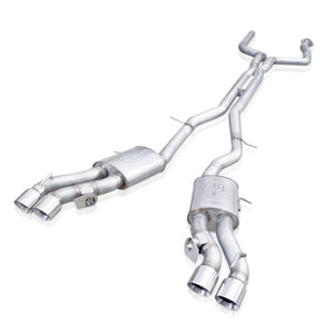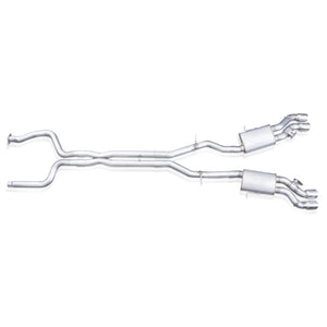 2016-19 Cadillac CTS-V Sedan exhaust system featuring 3" mandrel bent tubing into Dual-Mode Turbo mufflers with 4" diameter quad slash cut tips. Factory Connect option fits to the factory break-point. From there the exhaust travels into our crossover x-pipe with resonators. Includes functional Dual-Mode Performance valves in the tips which operate in conjunction with Tour and Track modes.